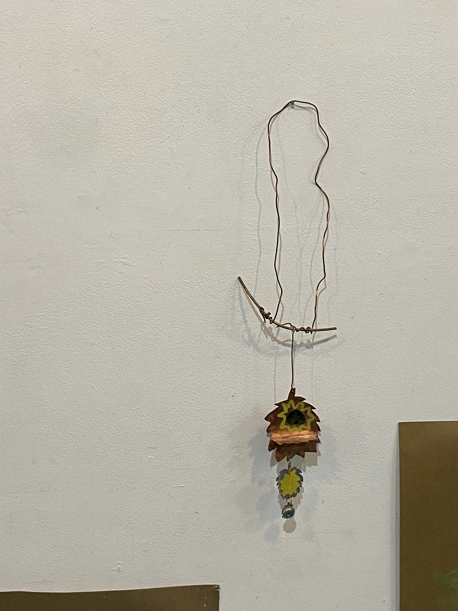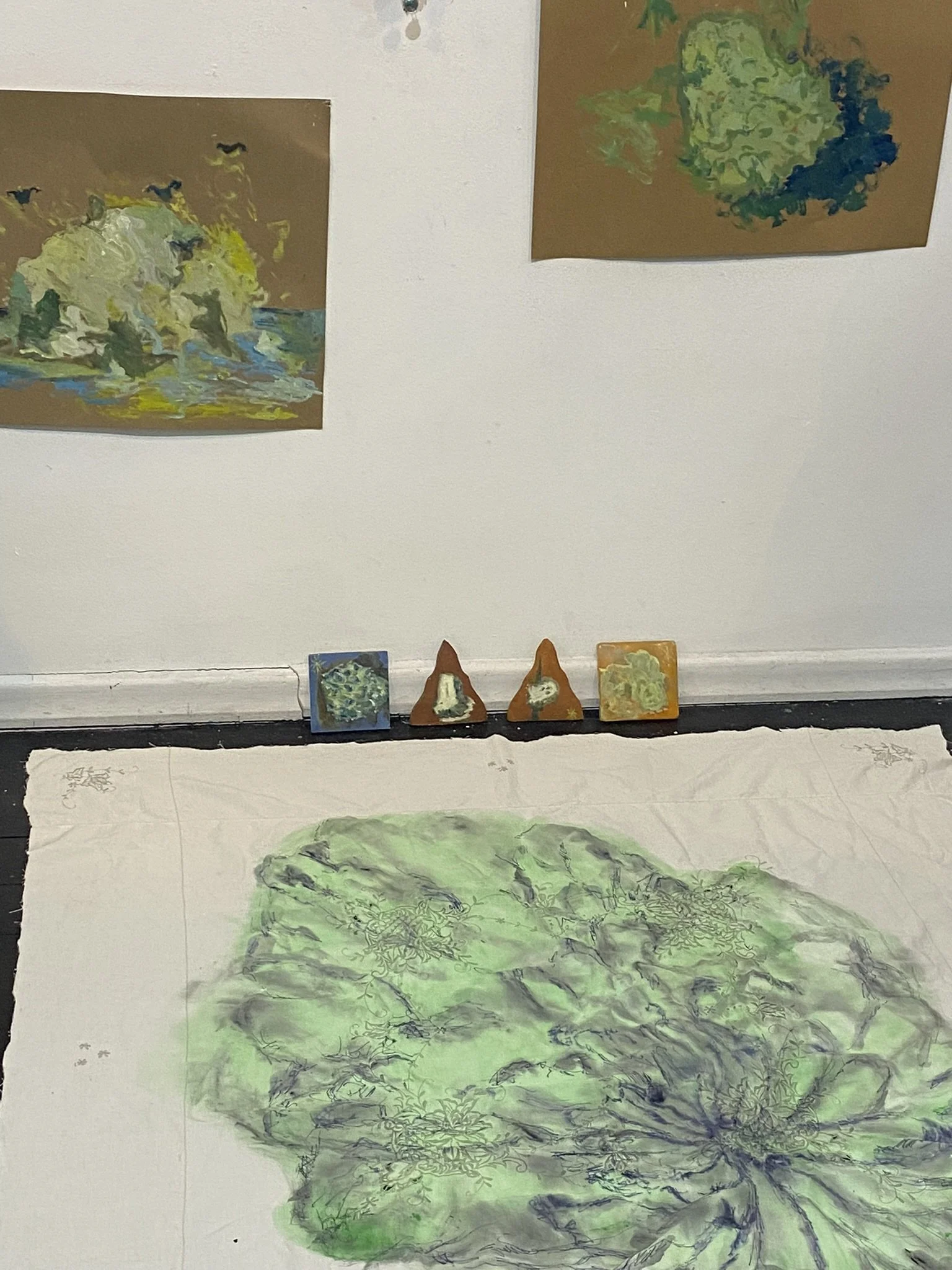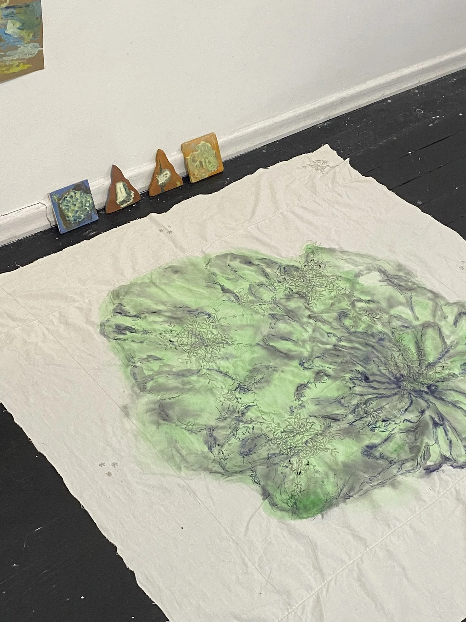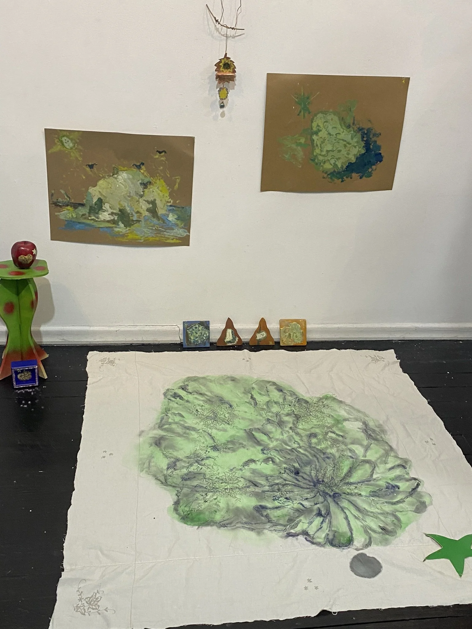 Mixed-media installation: textile, oil, acrylic, wood, metal, tiles, cardboard.